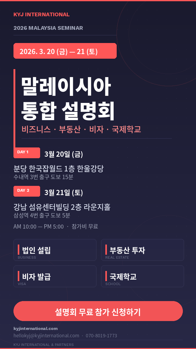 부동산·MM2H·법인설립·국제학교 및 대학 진학까지 전 과정을 전문적으로 지원합니다.